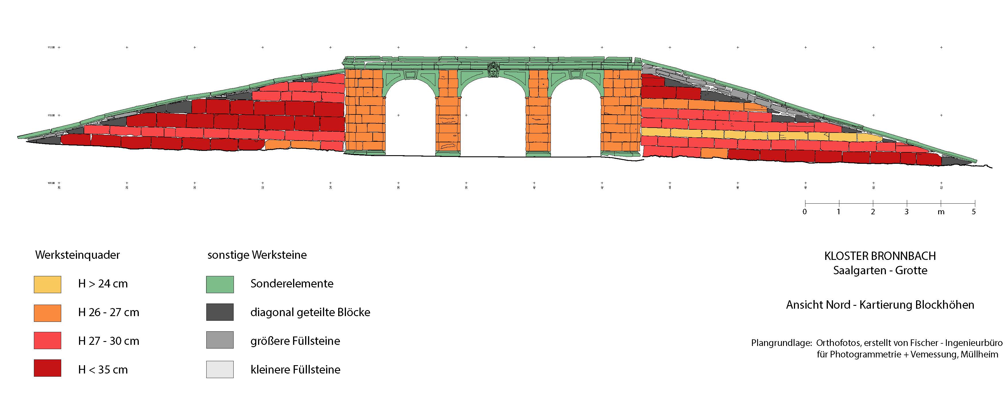 Zeichnung: Ansicht der Grotte im Saalgarten: Kartierung der Steinhöhen, 2021 - © P. Wiesinger und Ch. Brasse auf Grundlage eines Plands des Ingenieurbüros Fischer, Müllheim